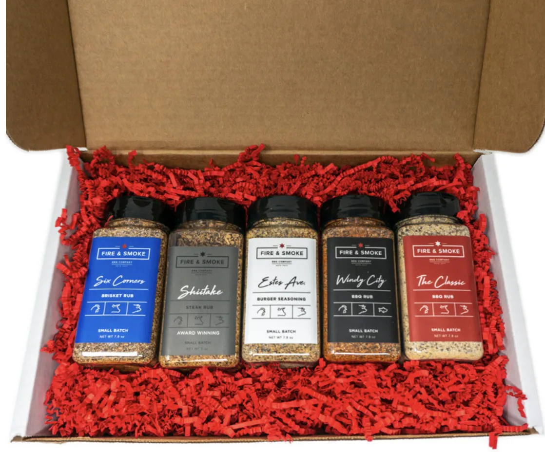 This 6 pack will include one of each of Fire & Smoke 6 rubs and seasonings: The Classic, Shiitake, Six Corners, Windy City, Second City, and Estes Ave.